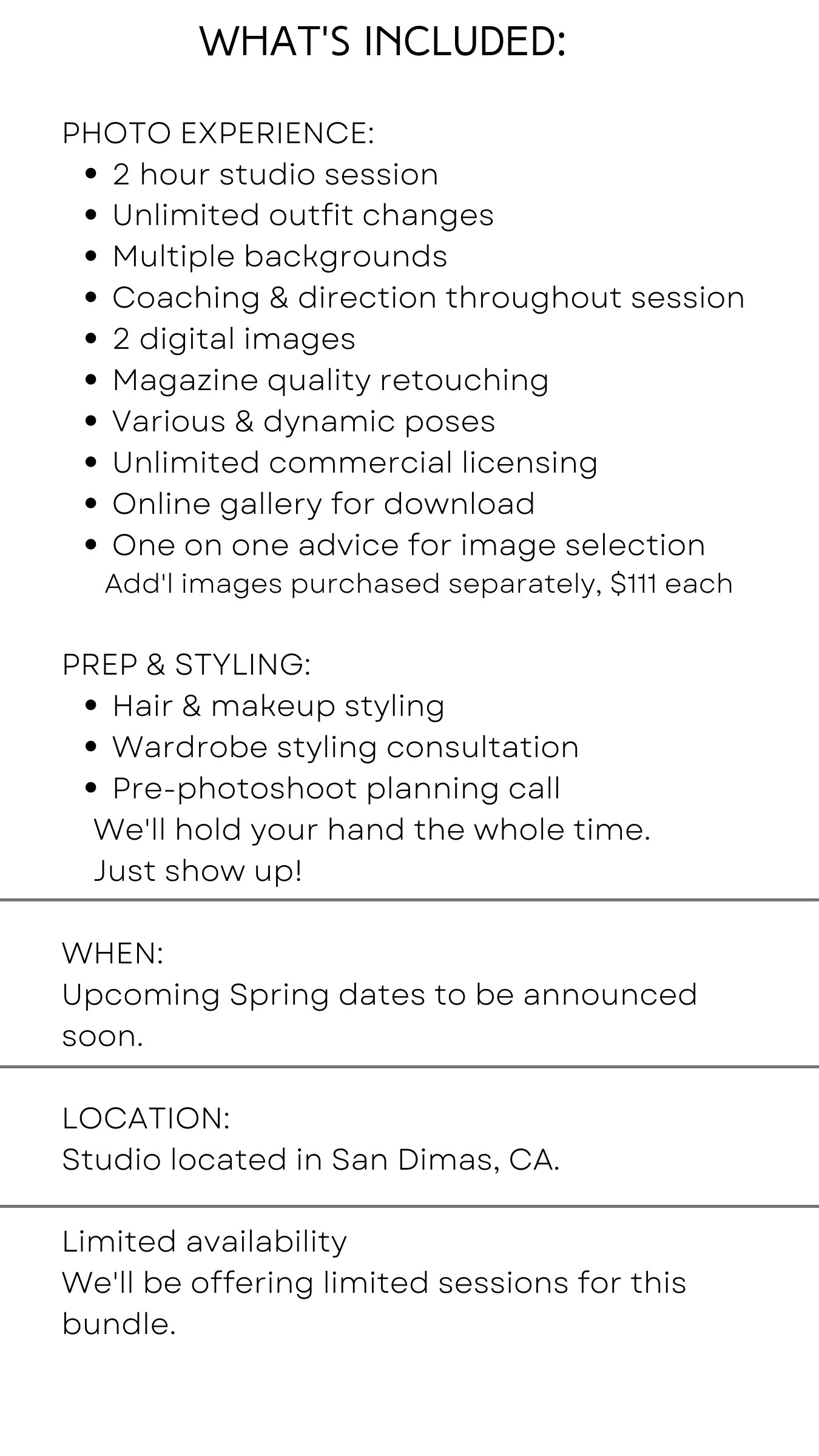 Who wouldn’t want to have a glow up with hair and makeup styling PLUS be guided by a wardrobe stylist, both dedicated to pampering you? Eliminate all stress and overwhelm of preparing for a photoshoot.